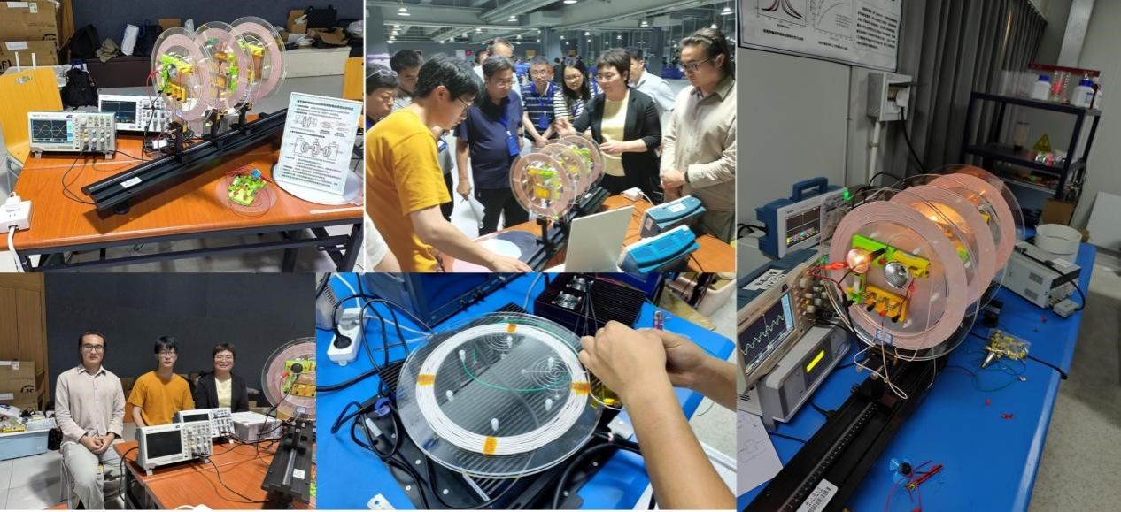 无线电能传输演示仪器已有商用产品,如何能再另辟蹊径实现创新?基于上海大学高温超导团队在无线电能传输领域的研究积累,郭艳群老师指导和带领徐茂川和李永正2位同学,基于电磁感应原理设计并搭建了双向无线电能传输演示仪器,通过同一个发射线圈,实现向左右两边接收线圈的双向/单向能量隔空传输;通过单刀双掷开关在回路中接入/切掉谐振电容,一键切换磁场耦合方式,创新性地实现磁共振/电磁感应能量传输的同时展示与直观对比。该实验仪器原理构思和实现历经十余次讨论和修改,仪器从部件制作到系统集成全部手工完成,整个过程师生全情投入,分工合作,在短时间内集中完成了仪器细节的完善。在评比过程中,该仪器凭借巧妙的设计,显著的演示效果,得到了2组独立评审团(每组十余位专家)和与会代表的高度认可,在全国20多个省市自治区的所有参评仪器中脱颖而出,获得一等奖。