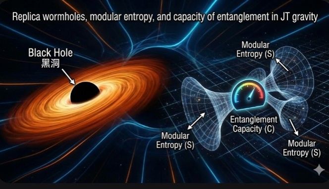 在这项研究中,课题组使用副本技巧研究了二维JT引力下的黑洞信息问题。更进一步,研究课题组计算了纠缠熵的关于副本参数n的拓展物理量——Renyi熵、模熵(modular