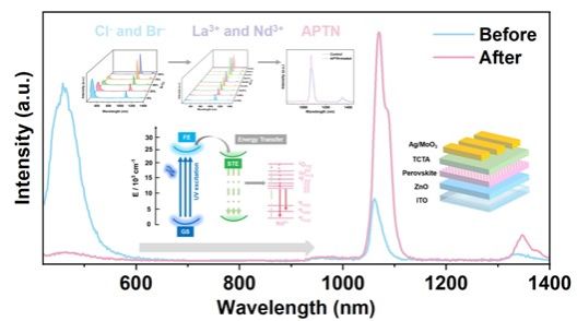 研究团队采用改进的热注射法系统地制备了Cs3La1-xNdxX6钙钛矿纳米晶。通过引入不发光的La3+并改变离子组成,实现了从自陷激子到Nd3+的接近100%的高效能量转移,PLQY为58.37%。经过APTN小分子修饰后,达到了64.65%的超高NIR-PLQY。制备的1070